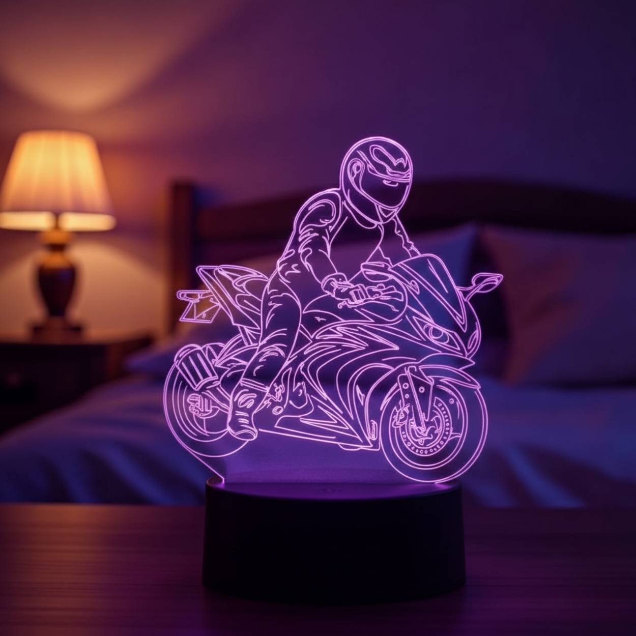 Cette lampe est idéale comme élément de décoration pour un bureau, une chambre ou un espace gaming. Elle diffuse une lumière douce qui crée une ambiance moderne et énergique, parfaite pour les passionnés de moto et de sports mécaniques.